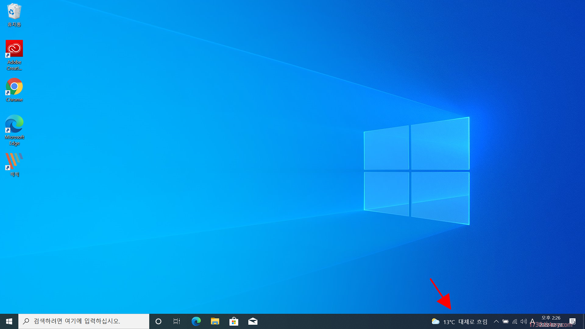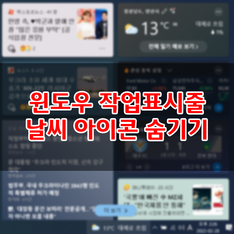 윈도우 10 작업 표시줄의 날씨, 온도를 표시해주는 뉴스 및 관심사 도구를 사용하지 않고 삭제하는 방법입니다.