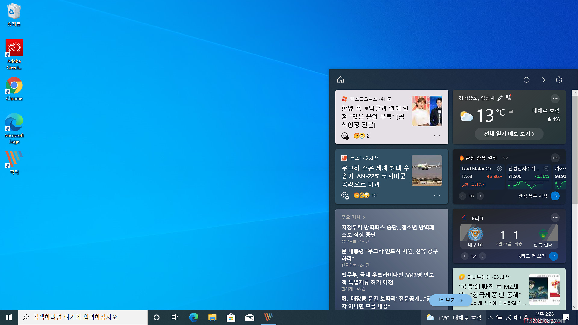 작업표시줄 트레이 아이콘 옆에 날씨를 표기해 주는데 위치 정보를 입력해주면 지역 날씨정보를 확인할 수가 있습니다.