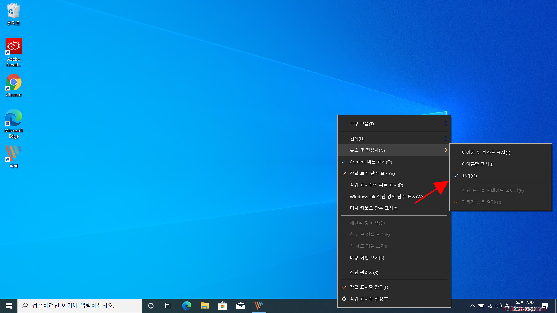 마우스를 뉴스 및 관심사 칸에 올리면 자동으로 메뉴가 확장되는데 기능은 "아이콘 및 텍스트 표시", "아이콘만 표시", "끄기" 3가지로 설정할 수 있습니다.