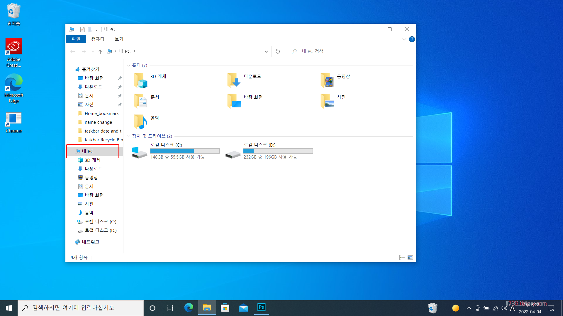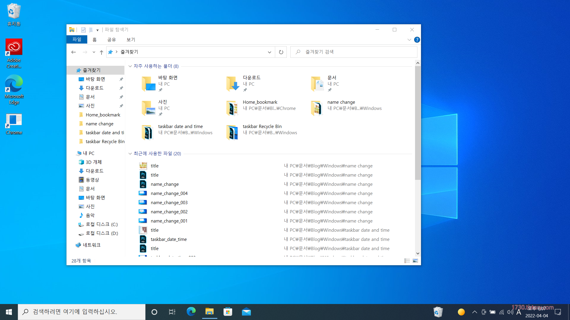 윈도우 10 탐색기를 실행하면 시작되는 위치가 내 문서, 다운로드 등의 라이브러리 목록이 즐겨찾기로 되어있는데 시작 위치를 내 컴퓨터로 바꿀 수 있습니다.