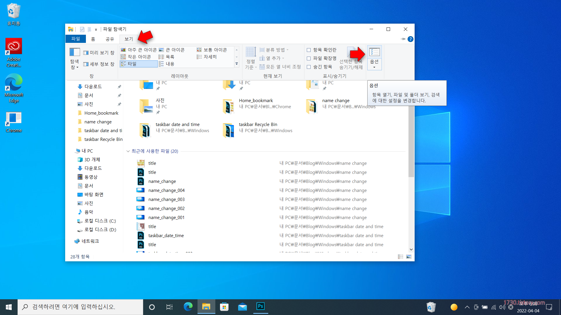 상단 탭에서 보기를 클릭하고 메뉴 중에서 오른쪽에 있는 "옵션"을 클릭하면 설정 메뉴가 열립니다.