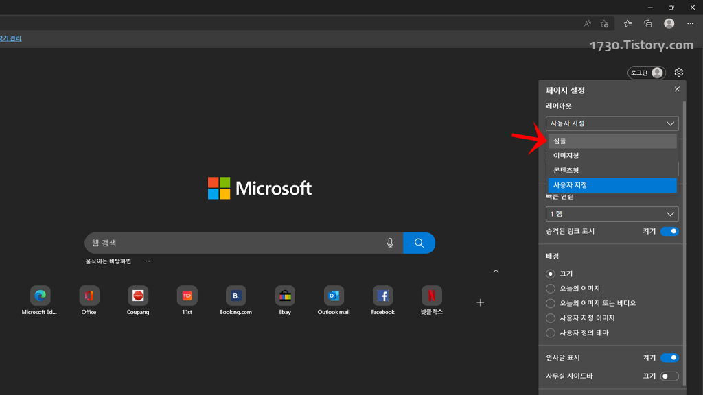 최상단 레이아웃 목록에 메뉴를 선택하여 심플을 선택하면 검색어 입력창과 바로가기 아이콘 이외에는 표시 되지 않습니다. 위 처럼 설정을 할때는 레이아웃을 먼저 심플로 설정하고 콘텐츠 끄기를 선택해야 배경화면 없이 새탭이 적용됩니다.
