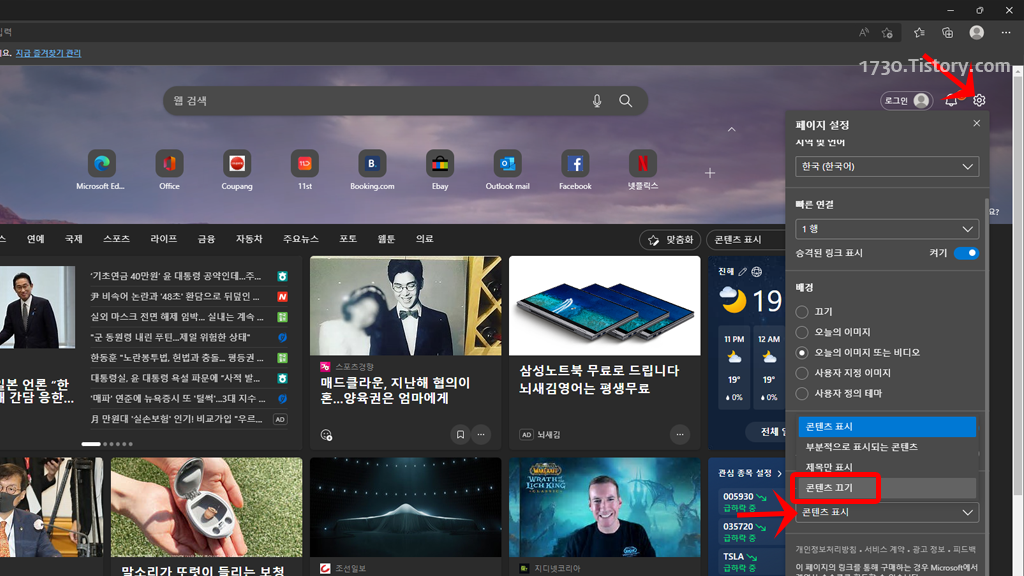 로딩이 길어지기도 하고 너저분하기도 하고 전혀 관심기반이 아니라 쓸모가 없어서 뉴스피드를 없애고 싶을 때는 우측 상단 톱니 모양 설정 아이콘을 클릭하여 페이지 설정이 열리면 스크롤을 내려 콘텐츠란에 콘텐츠 표시로 되어 있는 드롭다운 메뉴를 선택하여 콘텐츠 끄기를 선택하면 삭제되어 이후 하단에 표시하지 않습니다.