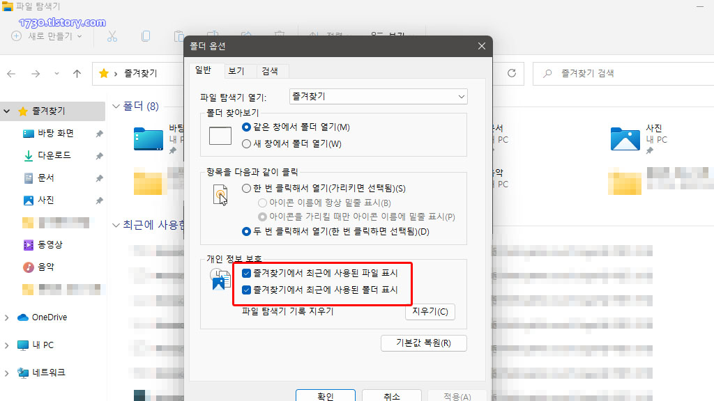 폴더 옵션에서 개인 정보 보호 항목의 기능을 체크 해제하여 저장 안함으로 설정이 되면 사용기록도 지워짐과 동시에 이후 사용하는 파일이나 폴더에 대한 기록을 남기지 않게 됩니다.
