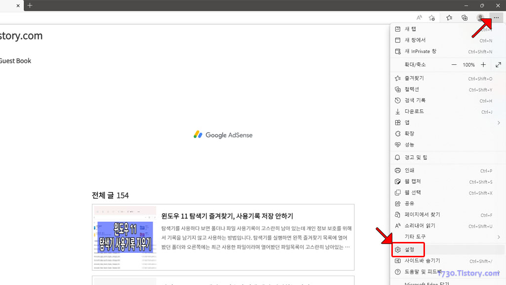 엣지 브라우저의 설정을 변경하기 위해서는 우측 상단에 있는 점 세 개 메뉴 버튼을 클릭하고 하단에 있는 "설정"을 선택하여 설정을 불러옵니다.