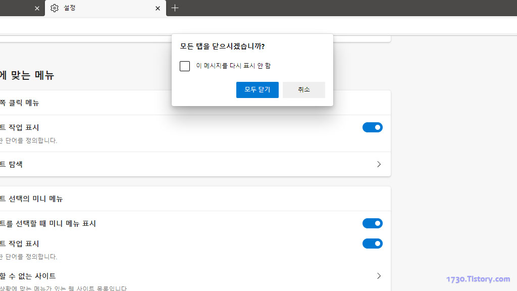 스위치를 켜고 나면 하나이상의 여러 탭이 열린 상황에서 브라우저 종료 버튼을 클릭하게 되면 "모든 탭을 닫으시겠습니까?"라는 알림 창이 나오고 모두 닫기를 클릭하면 브라우저가 종료하고 "이 메시지를 다시 표시 안 함"을 선택하면 이전에 수동으로 켜짐으로 변경한 설정을 다시 꺼짐으로 변경됩니다.
