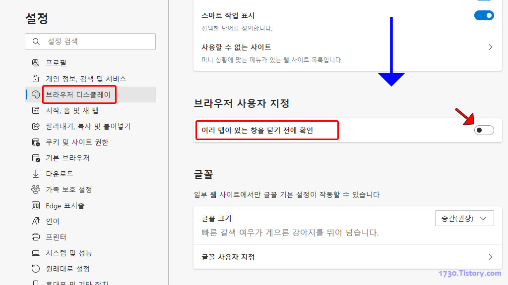 설정이 열리면 좌측 창에서 "브라우저 디스플레이"를 선택하고 우측 창에서 스크롤을 많이 내려 브라우저 사용자 지정이 나오면 "여러 탭이 있는 창을 닫기 전에 확인" 항목 오늘 쪽 스위치를 켭니다.