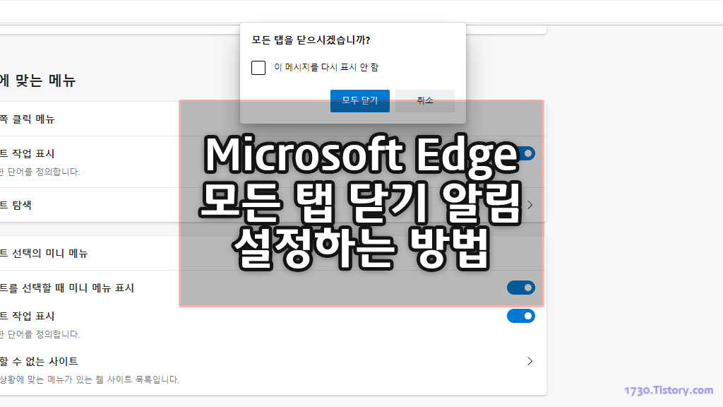 Microsoft Edge 브라우저를 이용하여 웹서핑 중 여러 탭을 열어놓고 사용하는 경우가 있는데 여러 탭을 열어 놓고 사용을 하가다 특정 탭을 닫을 때 실수로 브라우저를 종료 버튼을 클릭하면 예전에는 종료 전에 여러 창이 열림을 알리는 알림 창이 떠서 확인을 하였지만 예전과 달리 요즘은 질문이 없이 그냥 종료를 해버리는 데, 기본 설정이 활성가 되어있지 않아서 알림창을 활성화 하기 위해서 엣지 설정 변경이 필요합니다.