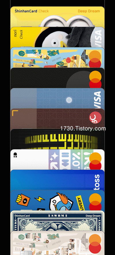 또 반대로 아래로 내리게 되면 등록되어 있는 카드 목록이 세로로 펼쳐지게 되고 원하는 카드를 빠르게 선택하여 사용할 수 있도록 보여줍니다.