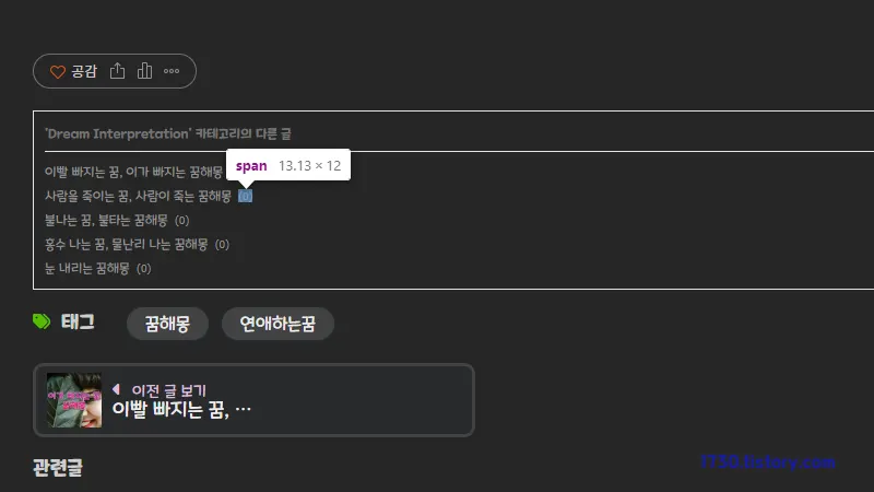 위와 같이 적용하여 화면에서 지울 수가 있습니다. 티스토리에서 값이 없는 경우는 리스트에 댓글의 경우 0이 아닌 값이 없이 표현이 됩니다.
