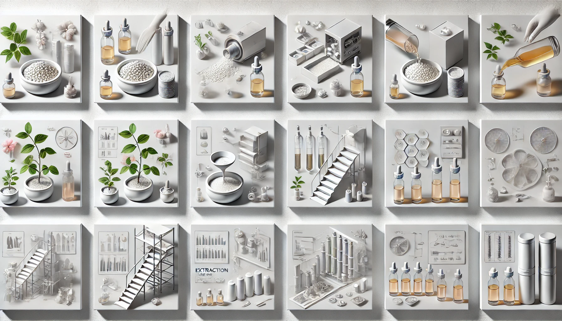 원료에서 향기를 추출하는 과정입니다. 주로 증류법, 압착법, 용매 추출법 등이 사용됩니다.